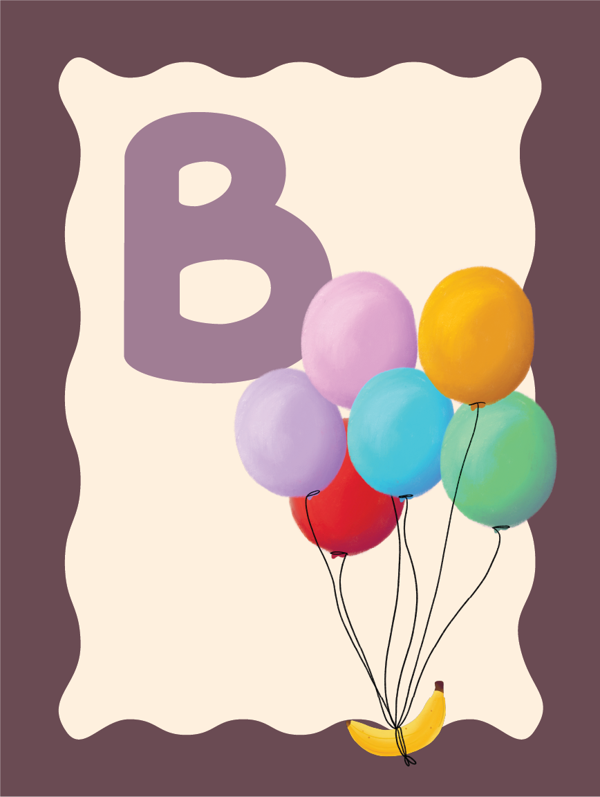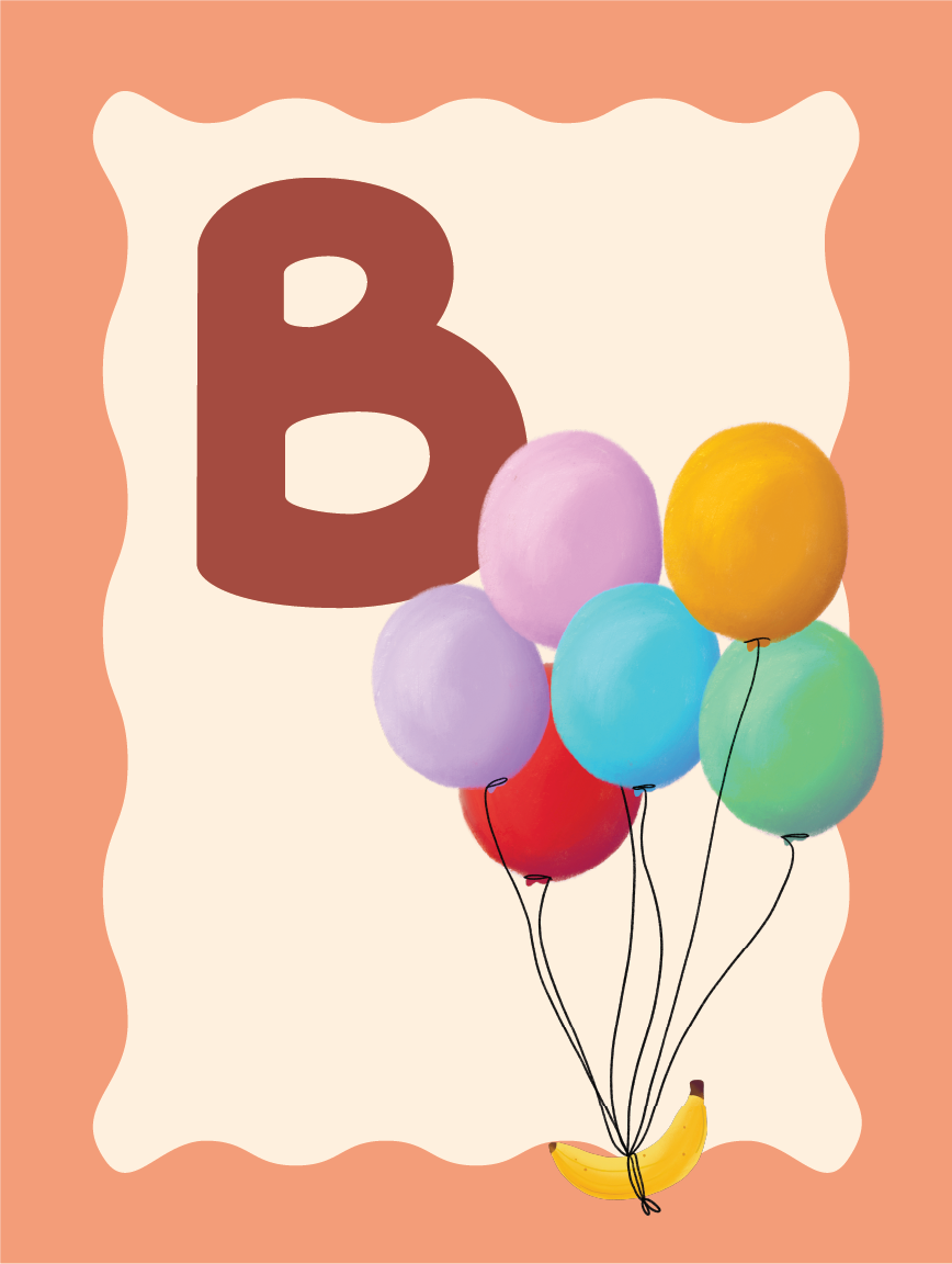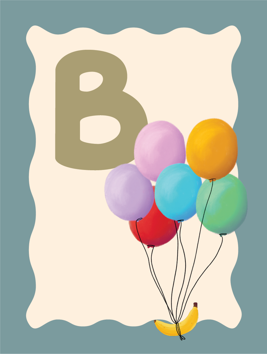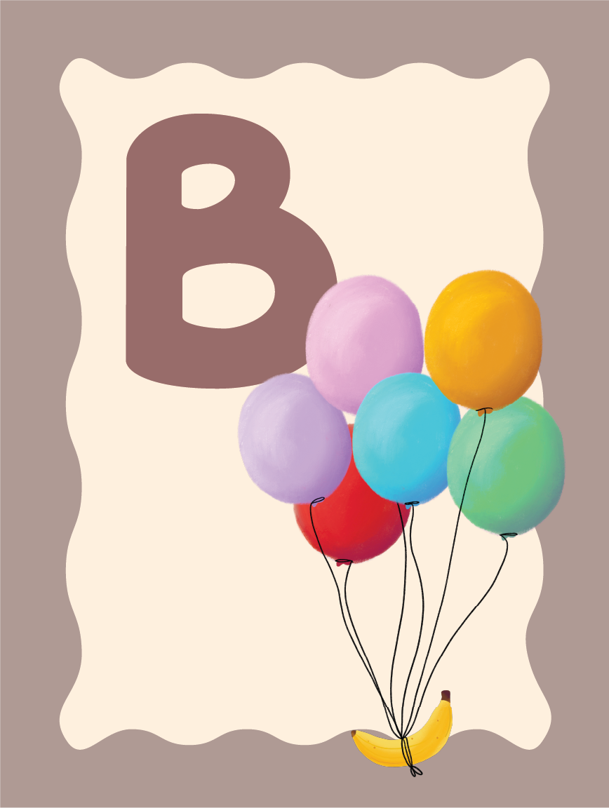 B is van banaan met ballonnen (veel!). Deze poster is een feestje aan de muur – perfect voor kleine vrolijkerds.