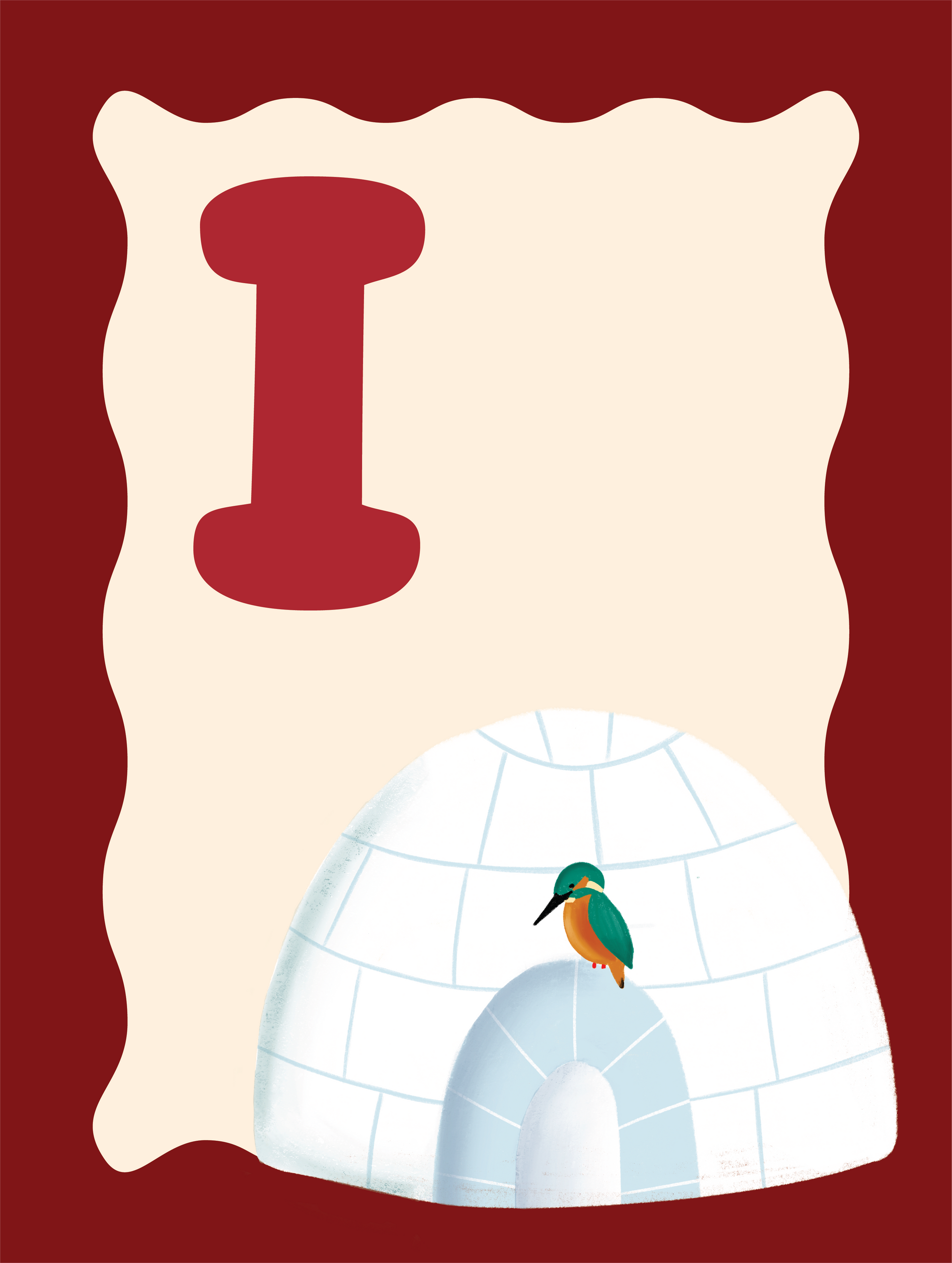 I is van iglo – lekker fris! En kijk, daar zit een kleine ijsvogel op het dak. Een winterse touch voor de stoere kinderkamer.