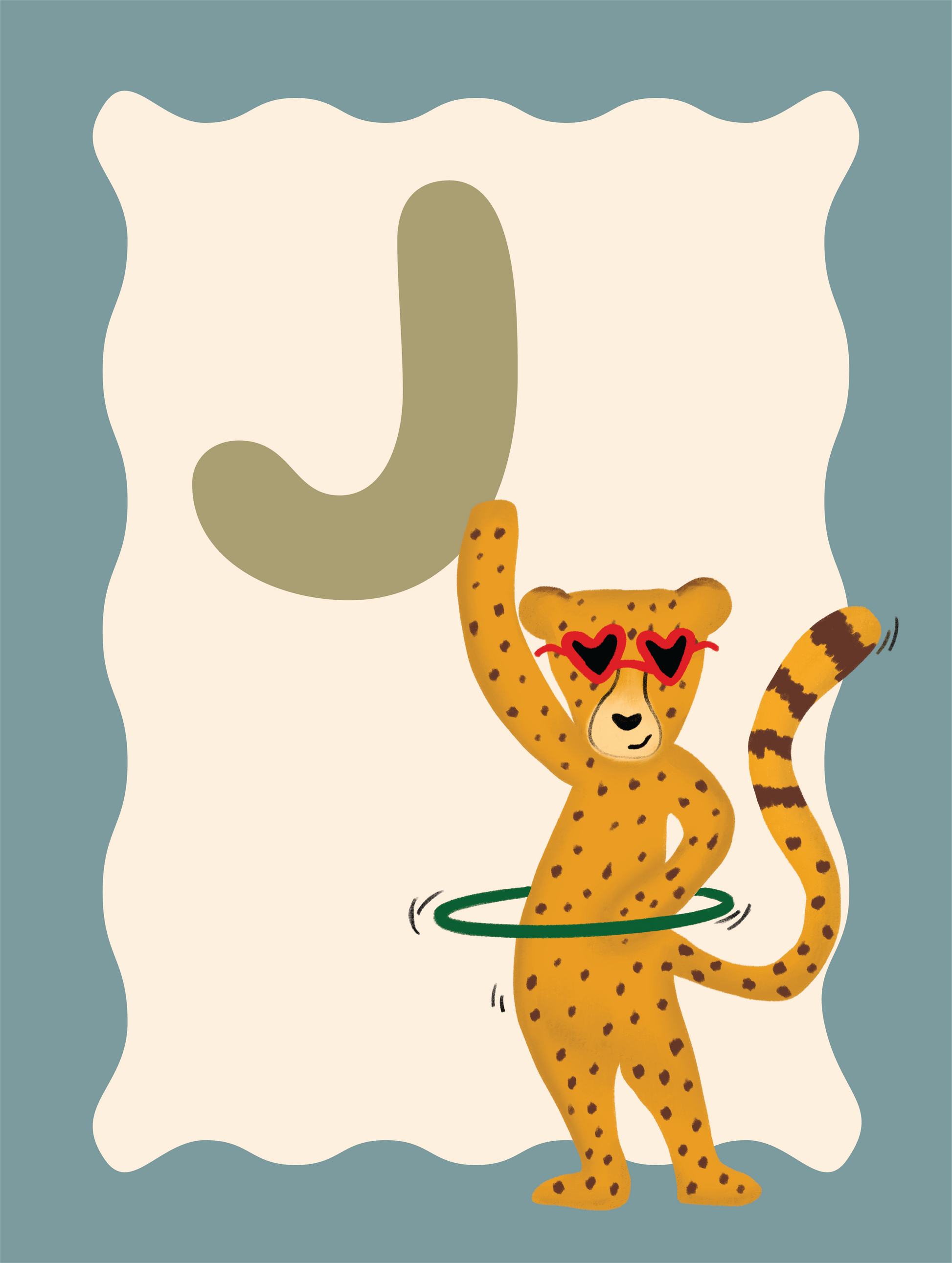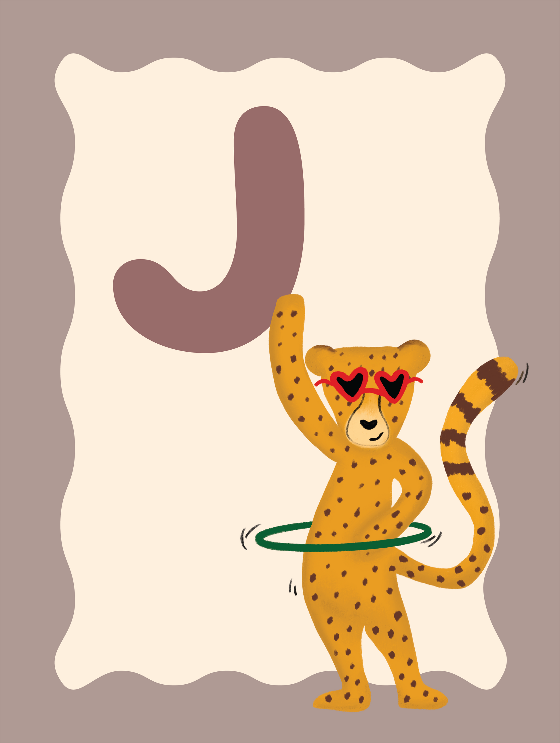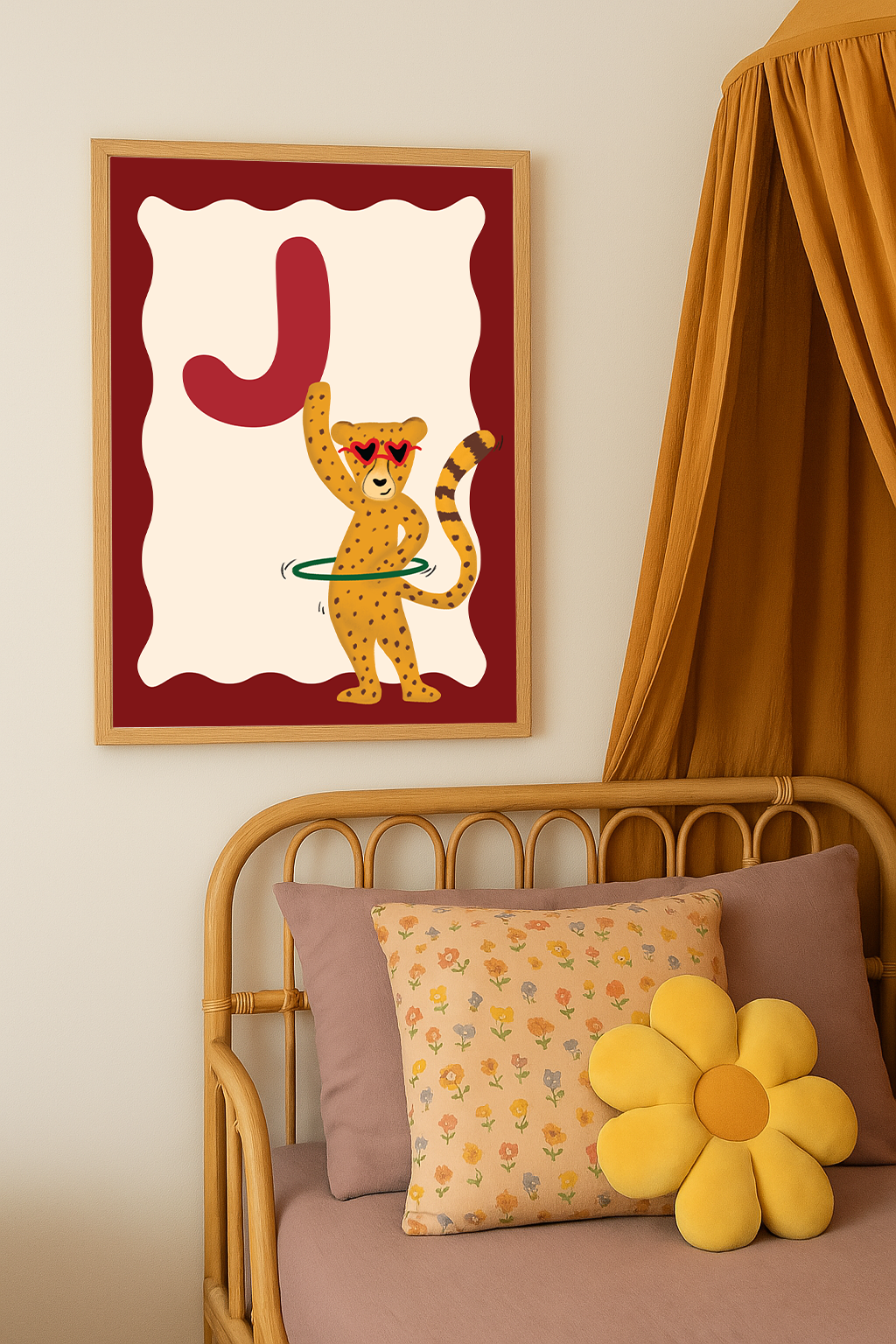 J van jachtluipaard! Maar deze is allesbehalve wild – hij swingt met z’n hoelahoep en rockt z’n hartjesbril. Een poster vol fun en flair.