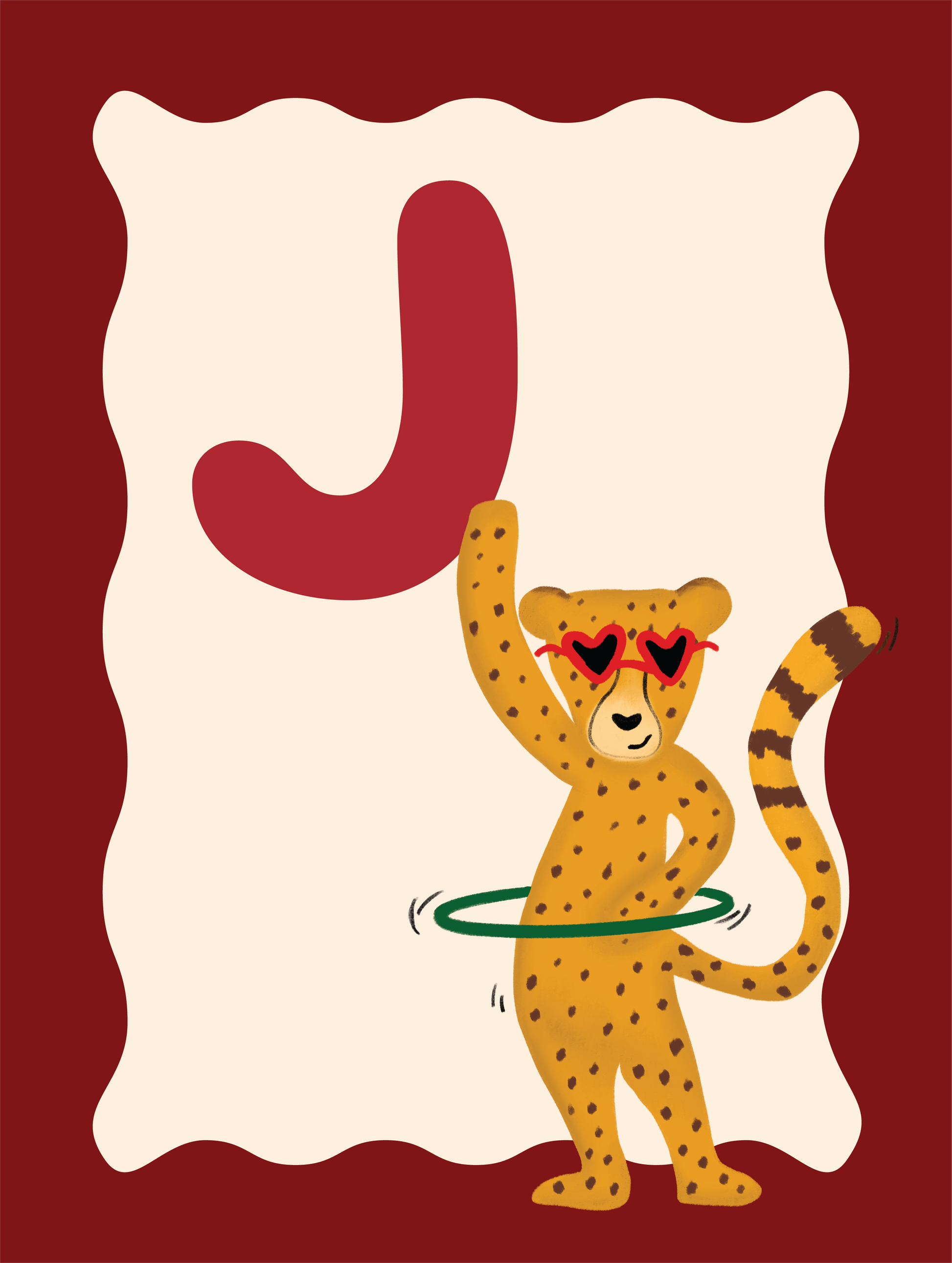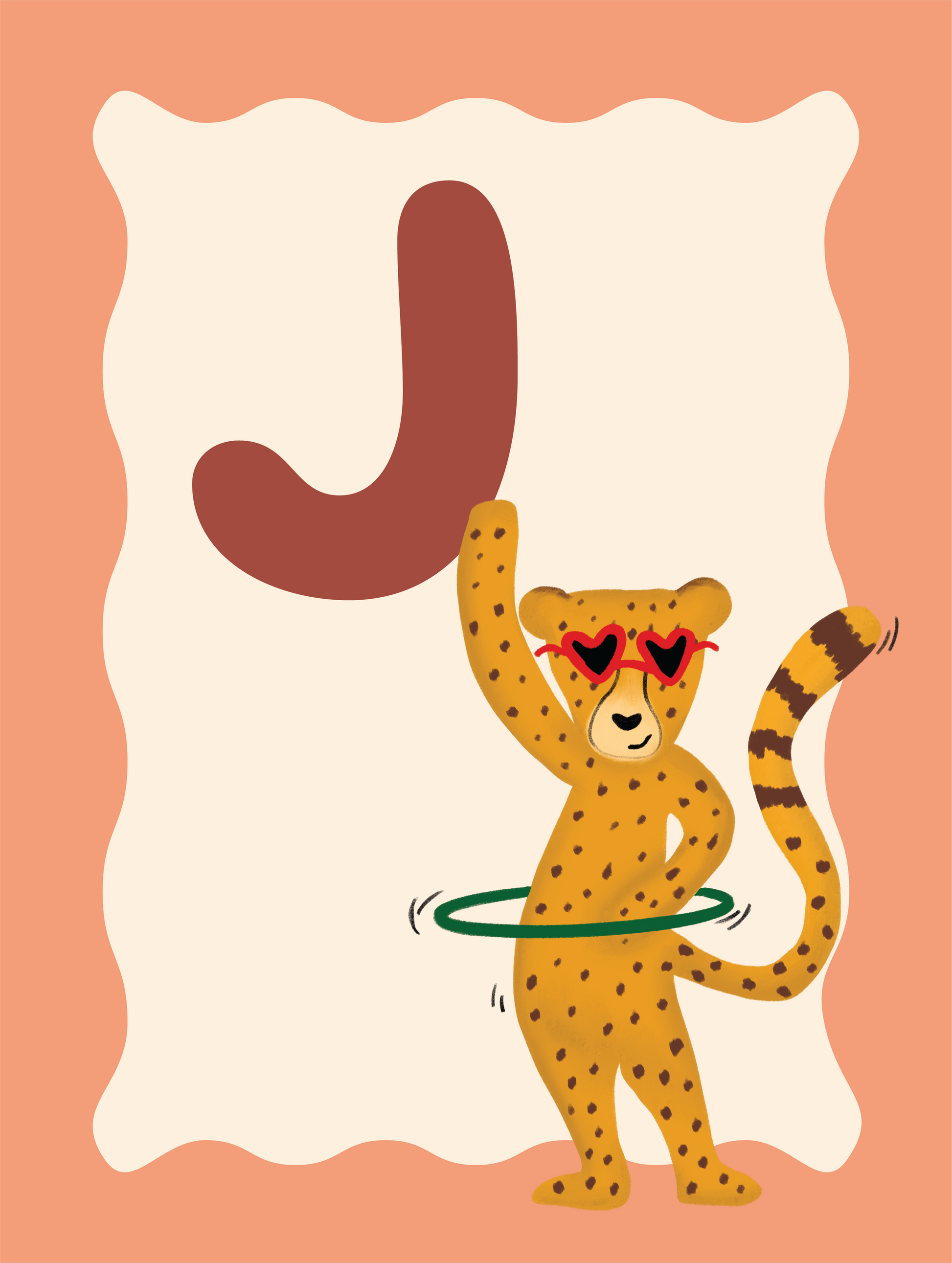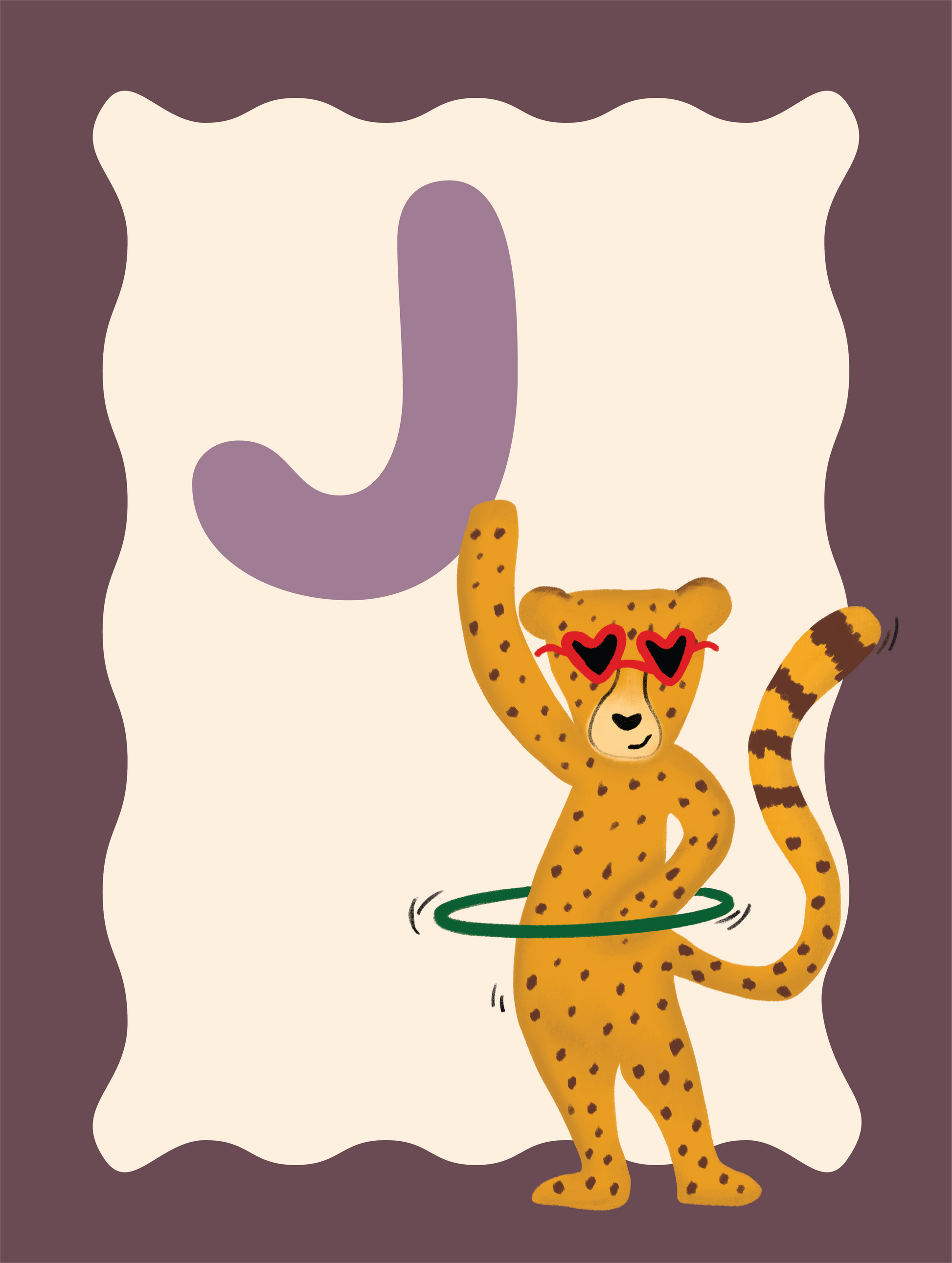 J van jachtluipaard! Maar deze is allesbehalve wild – hij swingt met z’n hoelahoep en rockt z’n hartjesbril. Een poster vol fun en flair.