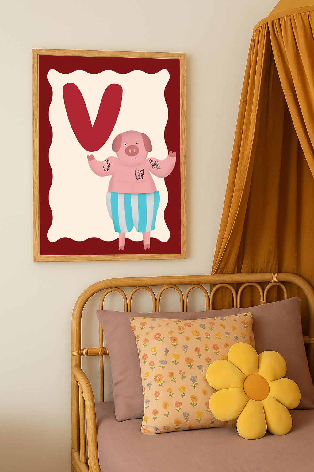 V is van varken! En niet zomaar eentje: deze vrolijke vriend heeft stoere tattoos maar een klein hartje.
