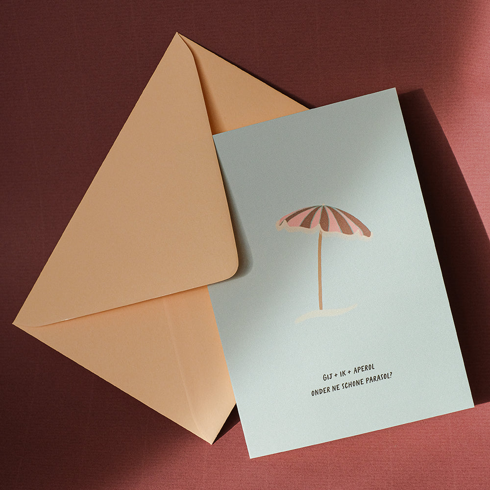 Tekst: ‘gij + ik + aperol onder ne schone parasol?’
