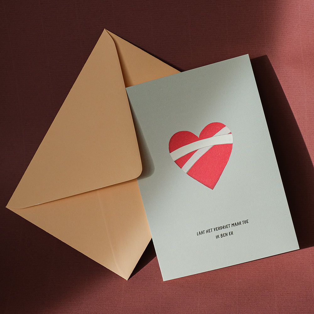 Dubbele wenskaart, duurzaam gedrukt op ongestreken papier. Inclusief gespikkelde gebroken witte envelop.